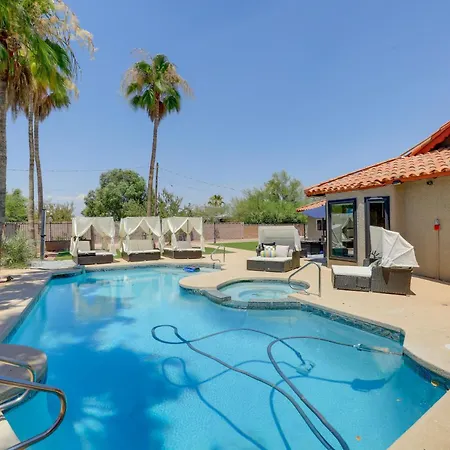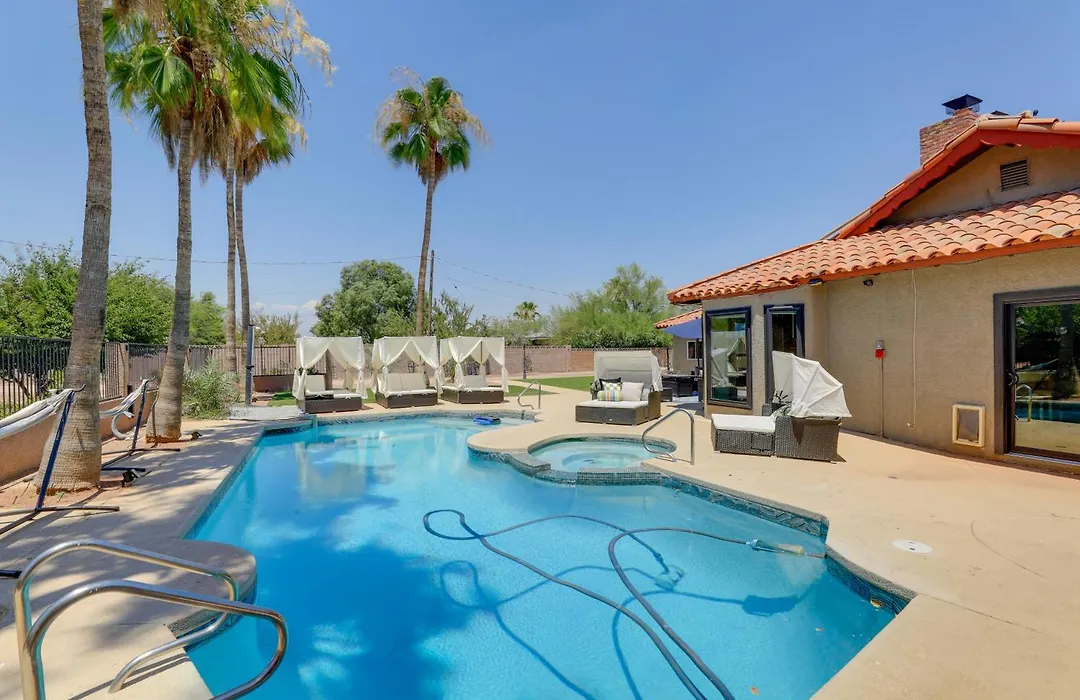 Spacious Las Vegas Getaway With Private Pool And Spa! villa has an equipped kitchenette with tea and coffee making equipment, a refrigerator, and kitchenware for a comfortable stay. McCarran International airport is 15 km away from the Las Vegas accommodation.